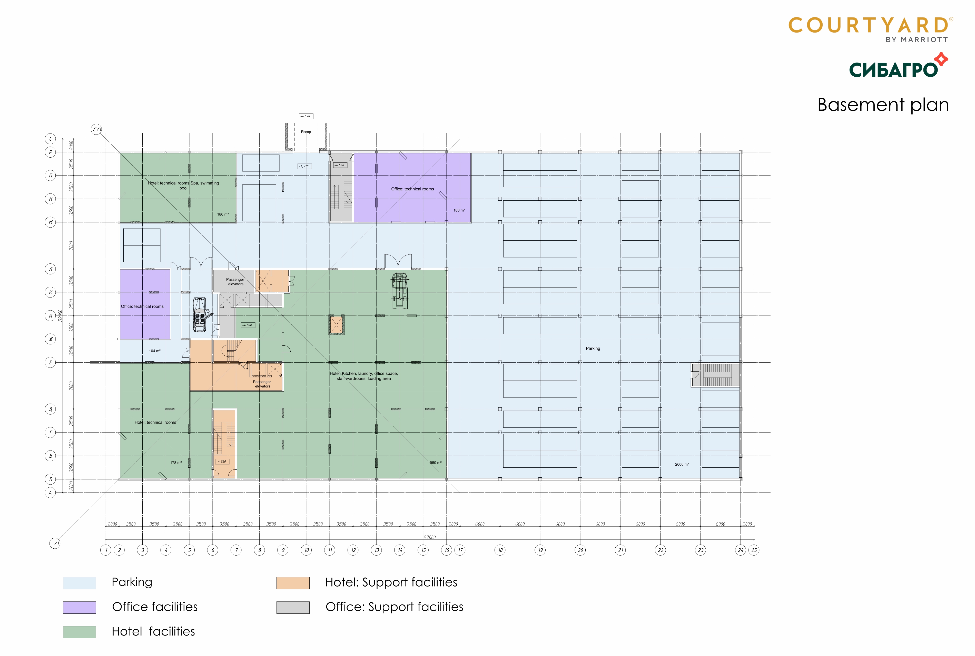 | Функционально 15-этажное здание разделено на 2 основные части по вертикали — офисы и гостиница | |